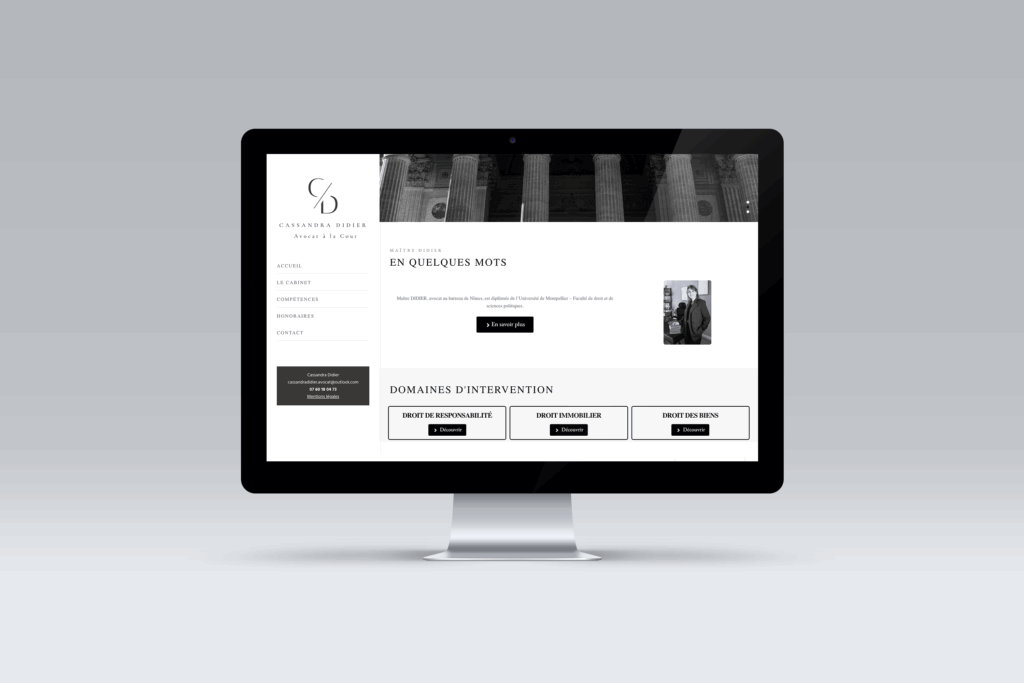 Création du site internet de Cassandra Didier, avocate au barreau de Nîmes : un design épuré et professionnel, pensé pour instaurer la confiance et faciliter la prise de contact en ligne.