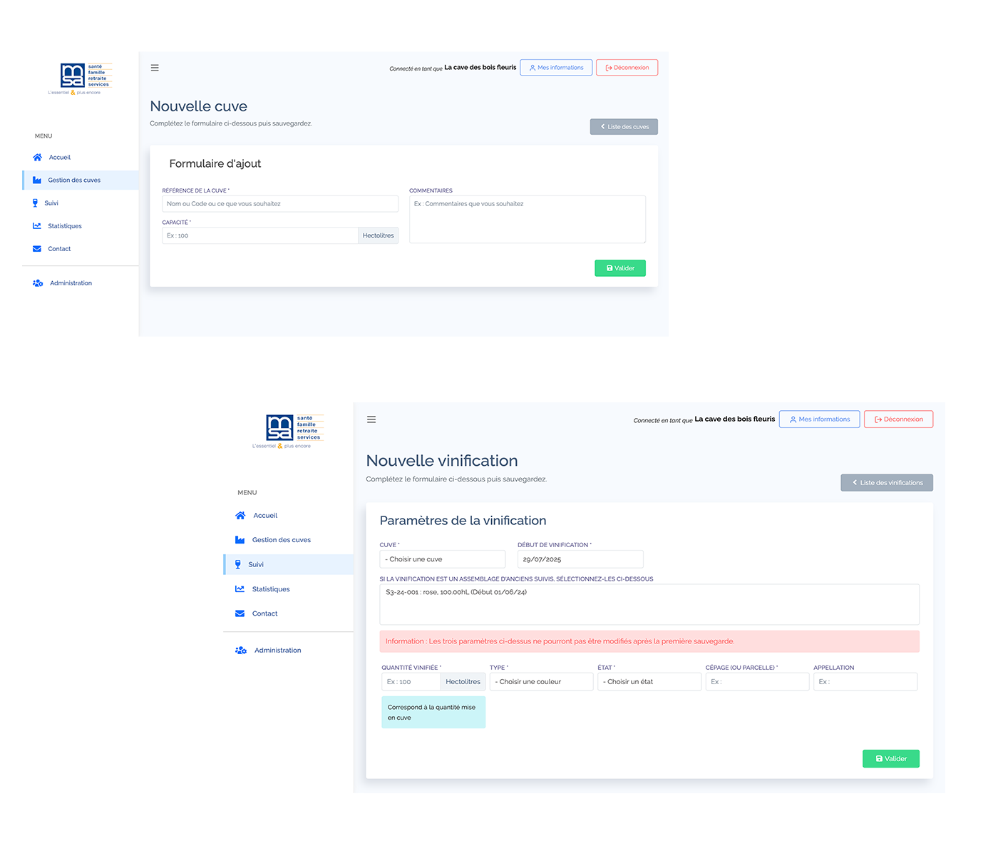Développement d’un outil sur-mesure pour la MSA Alpes-Vaucluse : une application web puis mobile, destinée aux caves coopératives et exploitations viticoles, pour faciliter le suivi quotidien de la vinification et mesurer les émissions de CO₂ liées à l’activité.
