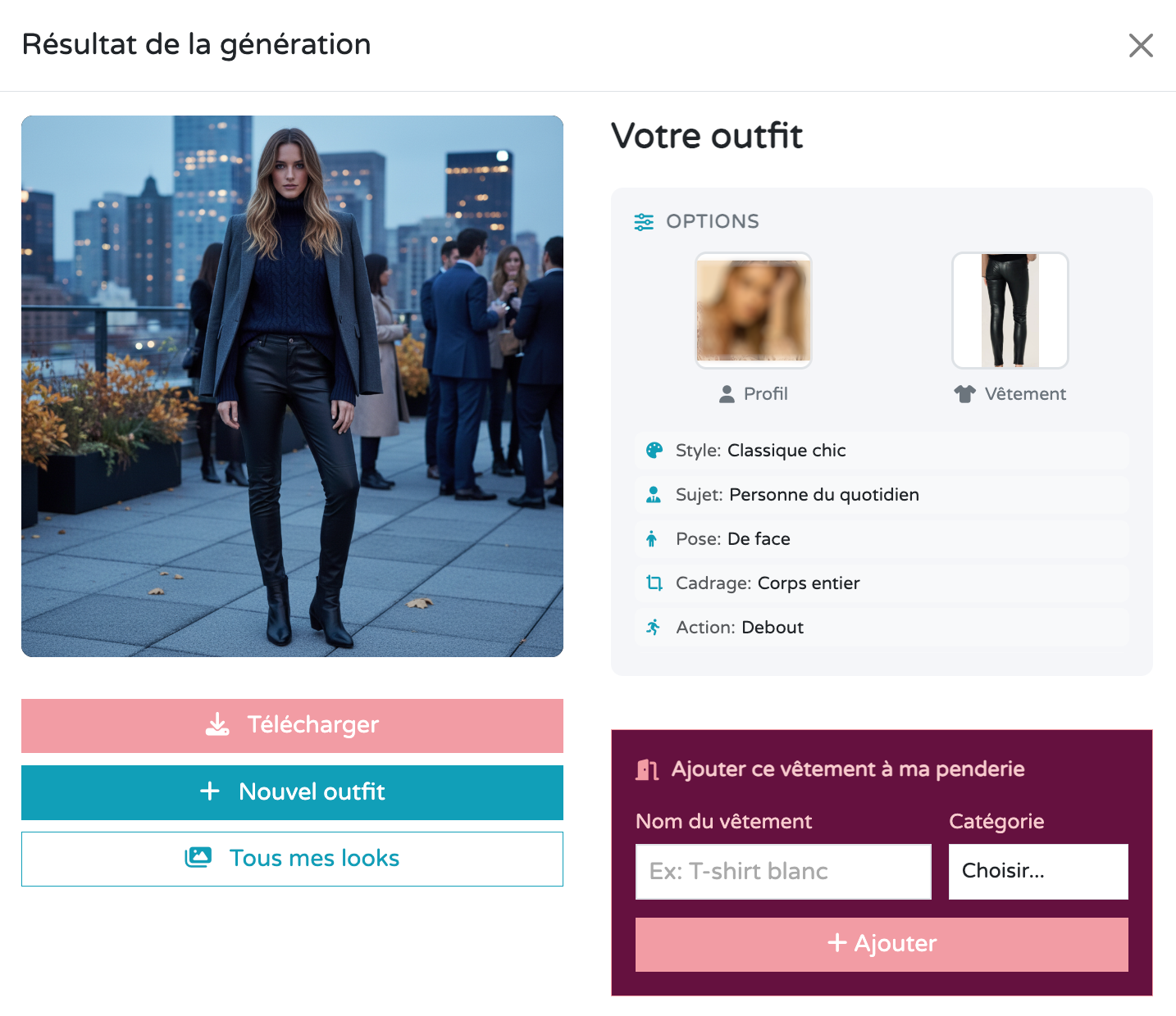 Le cœur du projet repose sur la génération visuelle d’outfits à partir de différents paramètres. L’utilisateur peut définir un style, une ambiance, un contexte ou une intention, puis laisser l’IA proposer une tenue cohérente, pensée comme une source d’inspiration créative plutôt qu’un simple rendu automatique.